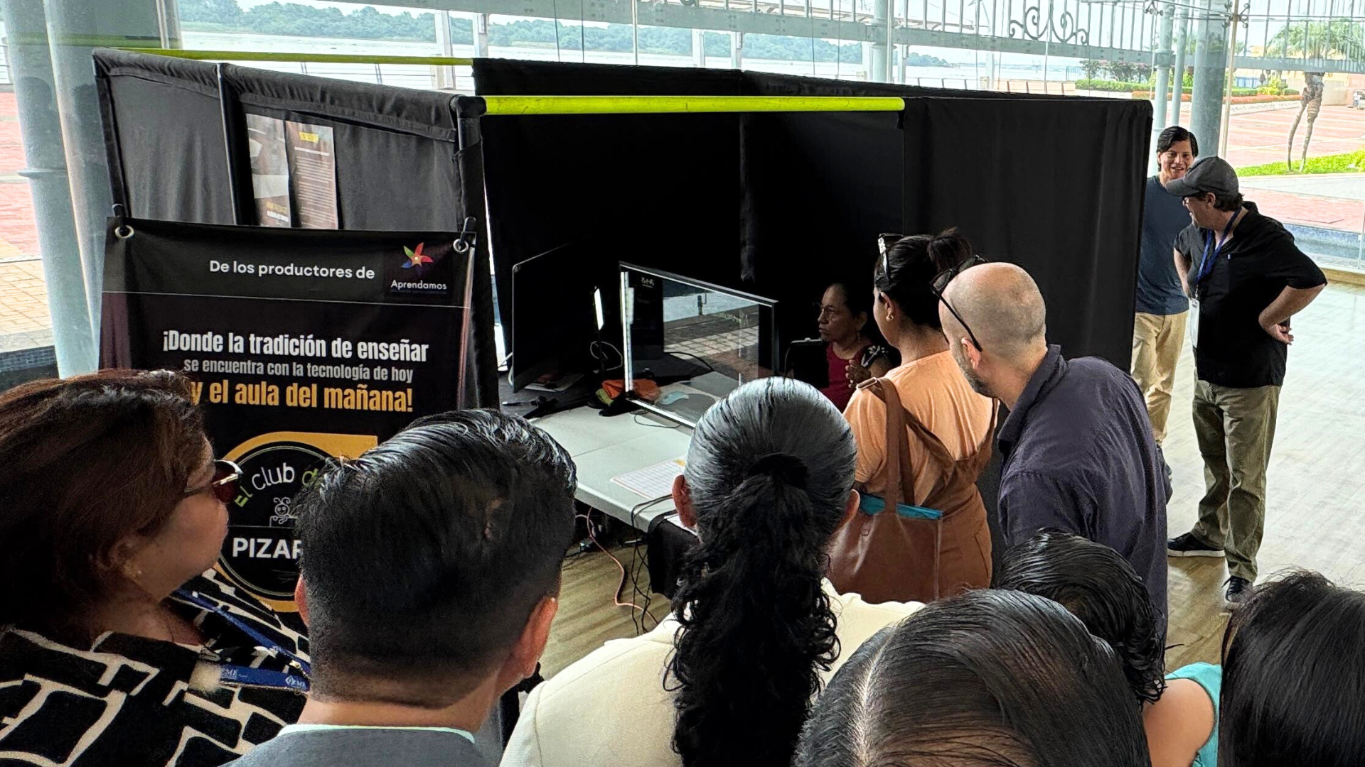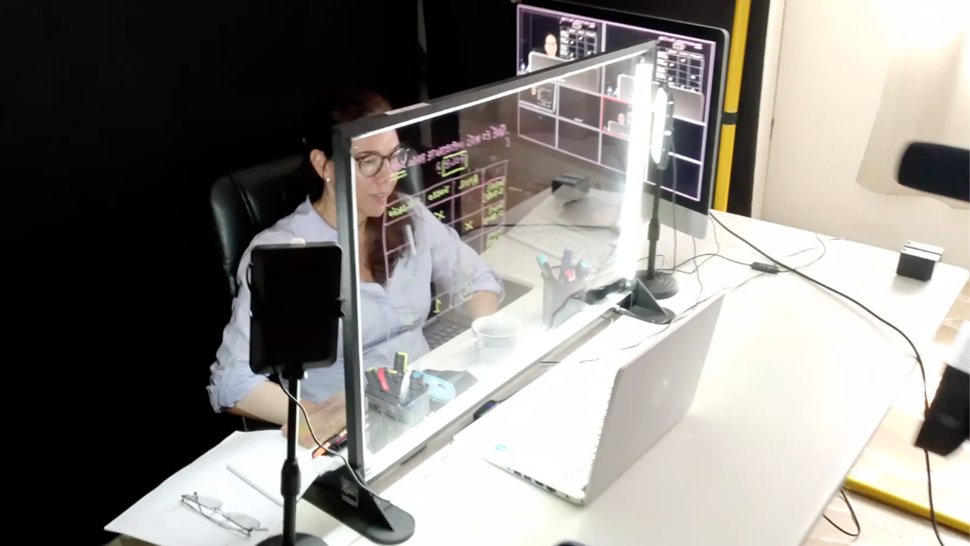 Ajusta el encuadre y listo. Estás frente a tus alumnos, mirándolos a los ojos mientras explicas, sin darles la espalda. Es la calidez de la pizarra tradicional con el poder de la era digital.